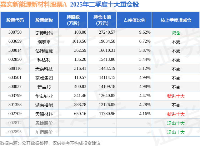 嘉实新能源新材料股票A的前十大重仓股如下:
