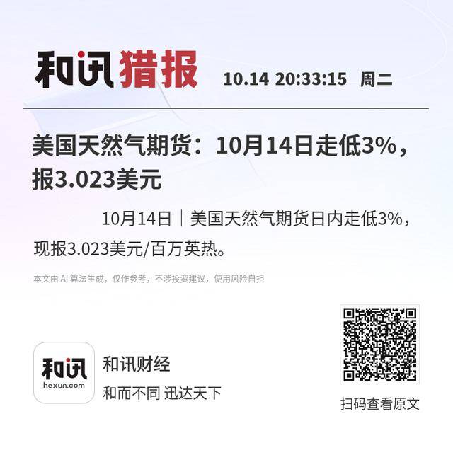 10月14日|美国天然气期货日内走低3%,现报3.023美元/百万英热。