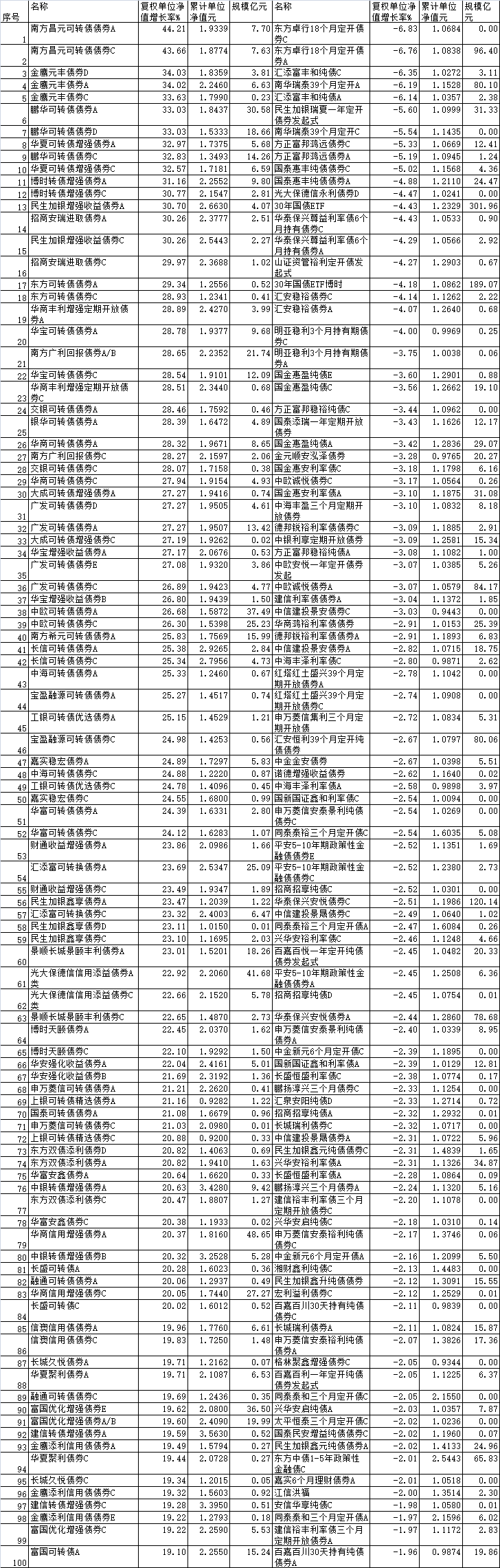 南方昌元可转债债券A、南方昌元可转债债券C以44.21%和43.66%的涨幅位居前列。该基金由累计管理经验10年的老将刘文良管理。资料显示,刘文良2012年7月加入南方基金,历任固定收益部转债研究员、宏观研究员、信用分析师。2015年2月26日至2015年8月20日任经理助理,2015年12月至今任基金经理。