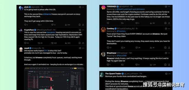 币安、Coinbase、Robinhood都出现了不同程度的宕机、延迟,用户订单卡住,账户锁定,眼睁睁看着自己的仓位被系统强平,没有人能逃得掉,情绪在社交媒体上像火山爆发一样蔓延。