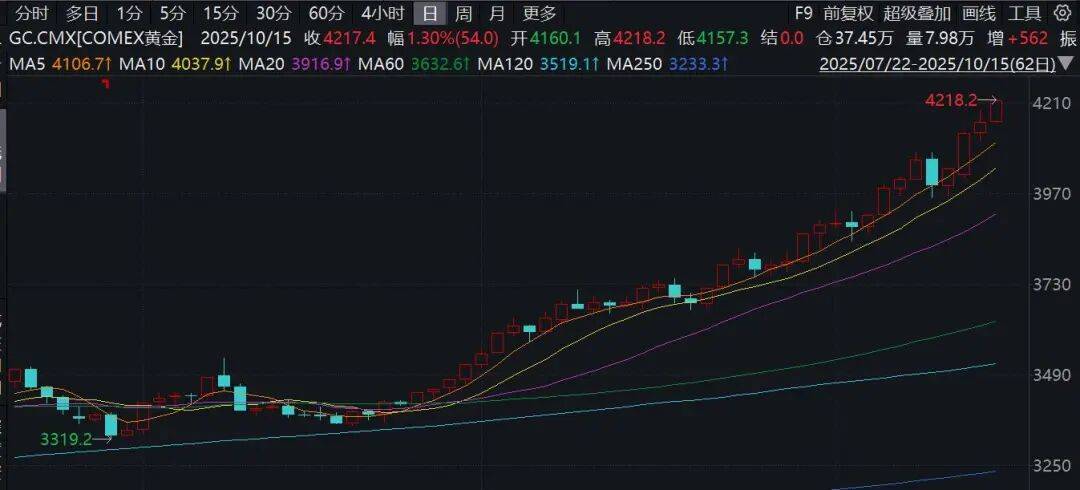 10月15日下午,现货黄金拉升涨逾1.4%,首次突破4200美元/盎司关口。