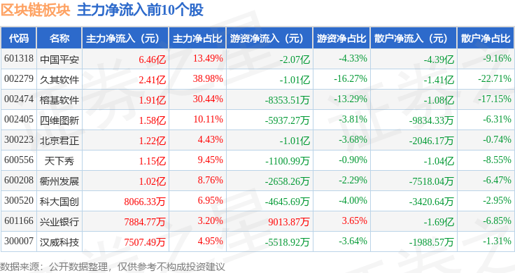 从资金流向上来看,当日区块链板块主力资金净流入4.5亿元,游资资金净流出8.28亿元,散户资金净流入3.78亿元。区块链板块个股资金流向见下表: