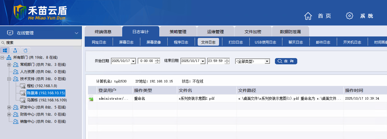 (5)文件操作记录:覆盖“上传-传输-使用-外发”全流程,支持离线管控、安全区域隔离与水印溯源(含工号、IP、时间戳)。