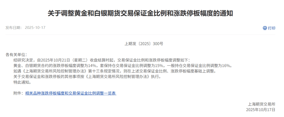 根据通知,自2025年10月21日(星期二)收盘结算时起,交易保证金比例和涨跌停板幅度调整如下:黄金、白银期货合约的涨跌停板幅度调整为14%,套保持仓交易保证金比例调整为15%,一般持仓交易保证金比例调整为16%。