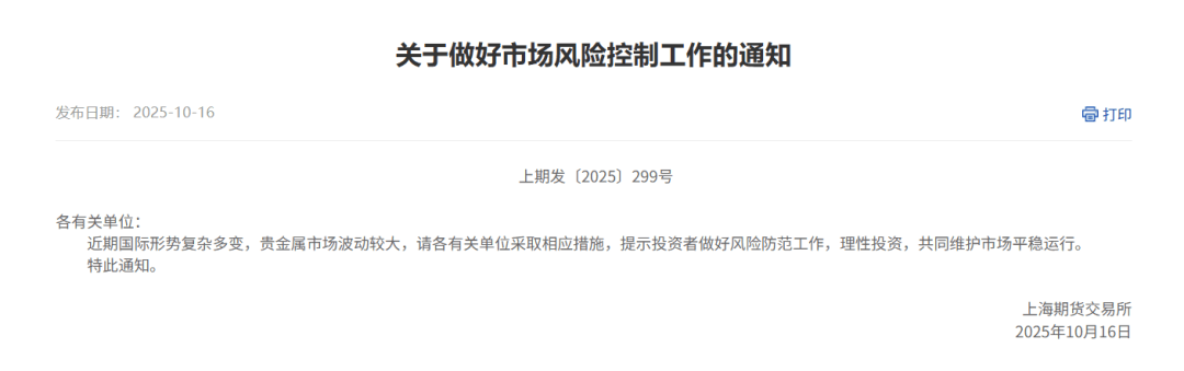 就在前一天,10月16日,上期所、上海黄金交易所均发布通知,要求有关单位提示投资者做好风险防范工作。上期所通知称:近期国际形势复杂多变,贵金属市场波动较大,请各有关单位采取相应措施,提示投资者做好风险防范工作,理性投资,共同维护市场平稳运行。