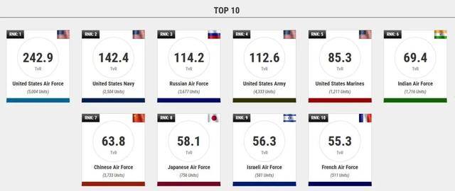 这个所谓的“世界现代军用飞机名录”网站,每年都会更新一份这样的榜单,今年的排名和去年基本没什么变化,美国海陆空三军及海军陆战队,依然作为四个独立主体,且全部挤进全球前五。
