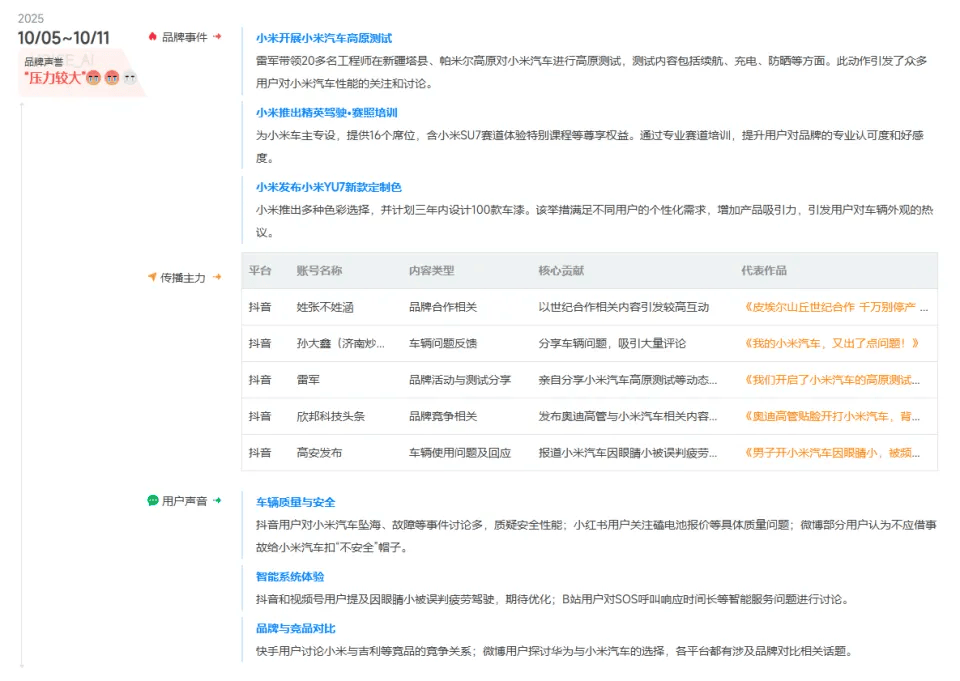 品牌与竞品对比:快手用户讨论小米与吉利等竞品的竞争关系;微博用户探讨华为与小米汽车的选择,各平台都有涉及品牌对比相关话题。