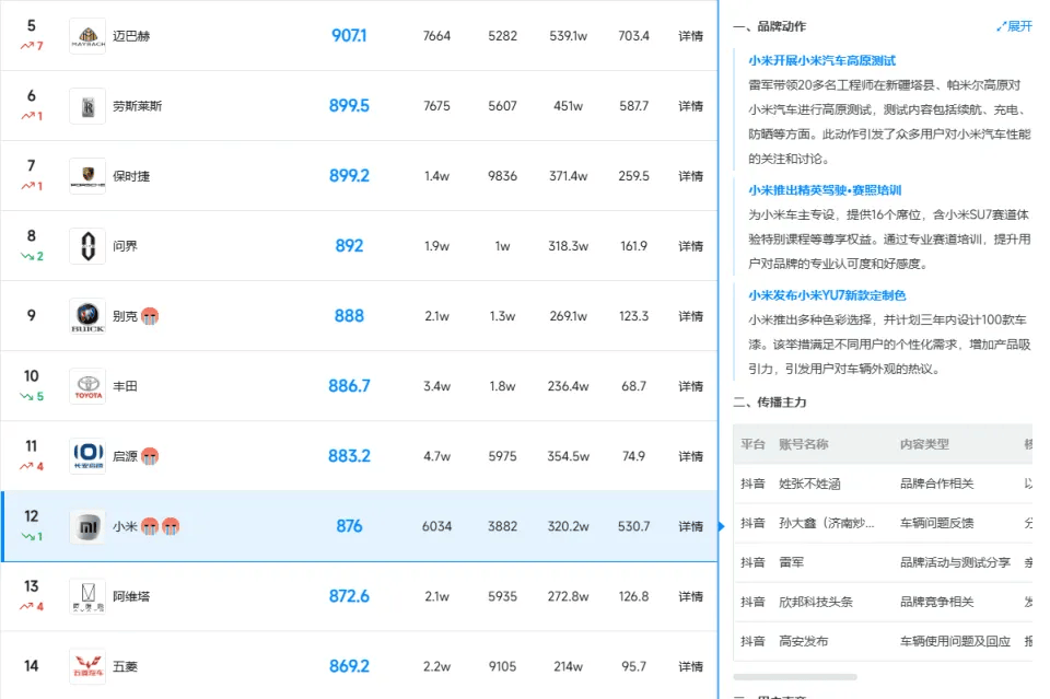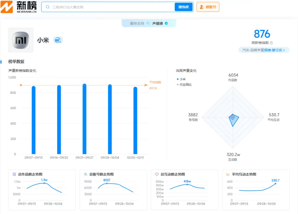 新榜品牌声量・汽车周榜(10月05日 - 10 月11日)发布,小米以876的声量新榜指数位居第12。