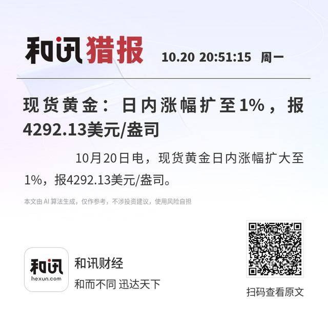 10月20日电,现货黄金日内涨幅扩大至1%,报4292.13美元/盎司。