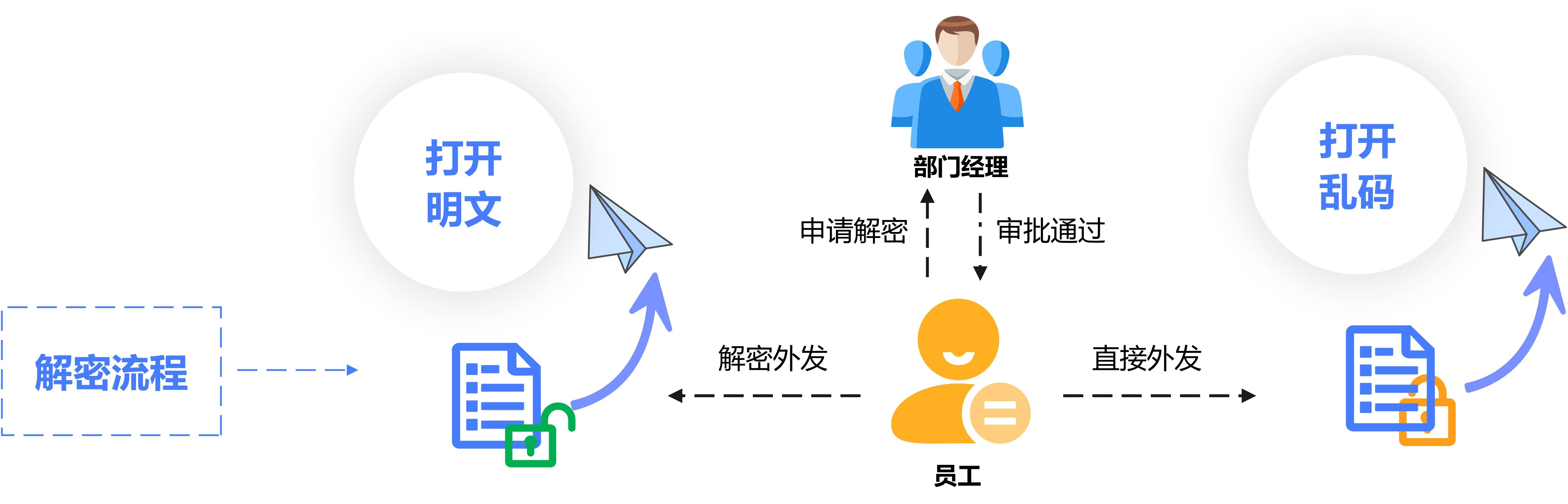 2.受控文件解密流程:在与外部协作需发送明文文件时,员工可提交解密请求,经审批流程由管理人员审核决定是否放行。支持多级审批、多人会签等灵活管控模式,确保敏感信息外传的合规性与可追溯性。