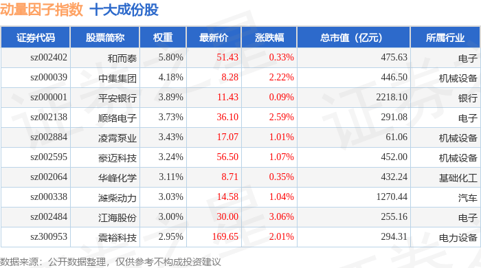 证券之星消息,10月21日,动量因子(980057)指数报收于2287.58点,涨1.7%,成交402.55亿元,换手率1.79%。当日该指数成份股中,上涨的有46家,瑞达期货以9.98%的涨幅领涨,下跌的有3家,新和成以0.3%的跌幅领跌。