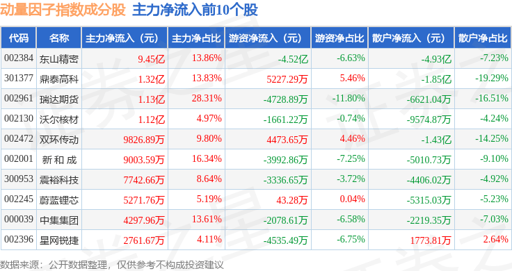 资金流向方面,动量因子(980057)指数成份股当日主力资金净流入合计12.92亿元,游资资金净流出合计7.0亿元,散户资金净流出合计5.92亿元。成份股资金流向详情见下表: