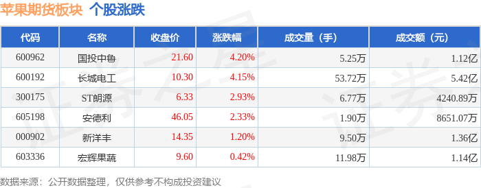 苹果期货板块10月21日涨2.... 证券之星消息,10月21日苹果期货板块较上一交易日上涨2.13%,国投中鲁领涨。当日上证指数报收于3...