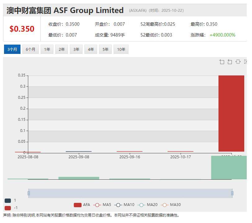 早盘拉升49倍后紧急停牌 AS... ( 图片来源:《澳华财经在线》) 早盘拉升49倍后紧急停牌 ASF Group (ASX:AFA)...