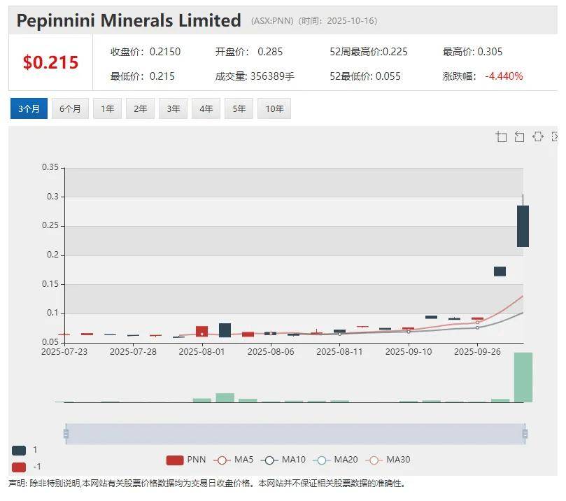 Power Minerals股价自6月底触底回升,并在10月初宣布收购美国加州Gamma重稀土项目后节节攀升,累计涨幅接近240%。