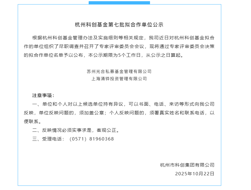 投资界10月23日消息,杭州市科创集团有限公司发布公告,公示了杭州科创基金第七批拟合作单位,本次公示拟合作单位共计2家,它们是:苏州光合私募基金管理有限公司、上海涌铧投资管理有限公司。