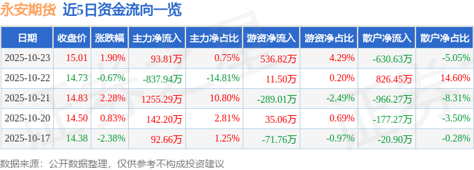 永安期货(600927)10月23日主力资金净买入93.81万元