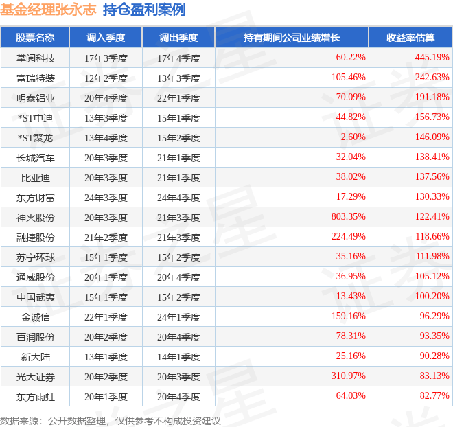 张永志管理的华商瑞丰短债债券A基金在17年3季度买入掌阅科技,在持有1个季度后在17年4季度卖出。持有期间的估算收益率为445.19%,持有期间掌阅科技在2016年到2017年的年报归属净利润增幅达60.22%。