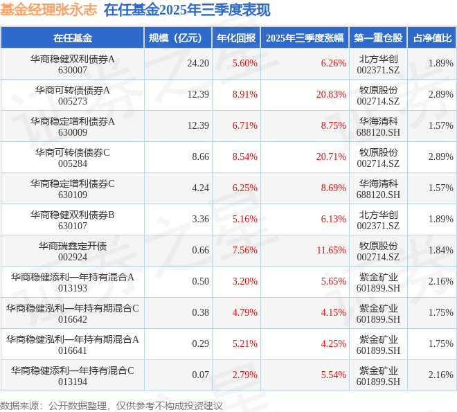 证券之星消息,截止2025年三季度末,基金经理张永志旗下共管理11只基金,本季度表现最佳的为华商可转债债券A(005273),季度净值涨20.83%。