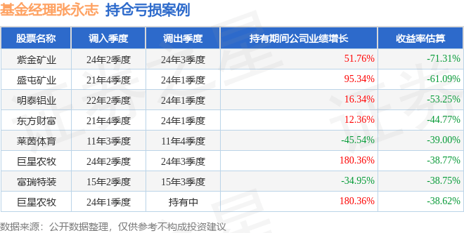 张永志管理的华商可转债债券A基金在24年2季度买入紫金矿业,在持有1个季度后在24年3季度卖出。持有期间的估算收益率为-71.31%,持有期间紫金矿业在2023年到2024年的年报归属净利润增幅达51.76%。