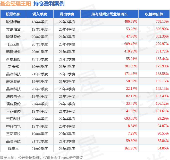 王阳管理的国泰智能装备股票A基金在18年4季度买入隆基绿能,在持有3年又3个季度后在22年3季度卖出。持有期间的估算收益率为758.13%,持有期间隆基绿能在2018年到2022年的年报营业总收入增幅达486.69%。