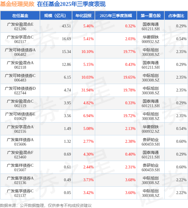 证券之星消息,截止2025年三季度末,基金经理吴敌旗下共管理14只基金,本季度表现最佳的为广发可转债债券D(022744),季度净值涨19.78%。