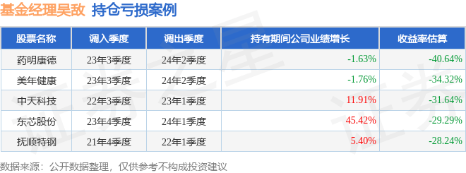 吴敌管理的广发安盈混合A基金在23年3季度买入药明康德,在持有3个季度后在24年2季度卖出。持有期间的估算收益率为-40.64%,持有期间药明康德在2023年到2024年的年报归属净利润降幅为1.63%。