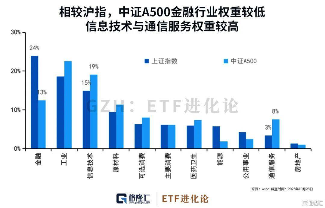 中证A500聚焦细分赛道龙头的行业均衡编制方法,是获得超额收益的重要原因。以中证一级行业分类为比较口径,中证A500指数金融行业权重为13%,低于上证指数的24%;信息技术及通信服务权重为27%,高于上证指数的18%。