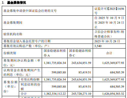 募集期间净认购金额1,625,369,877.93元,认购资金在募集期间产生的利息684,505.39元,募集份额合计1,626,054,383.32份。