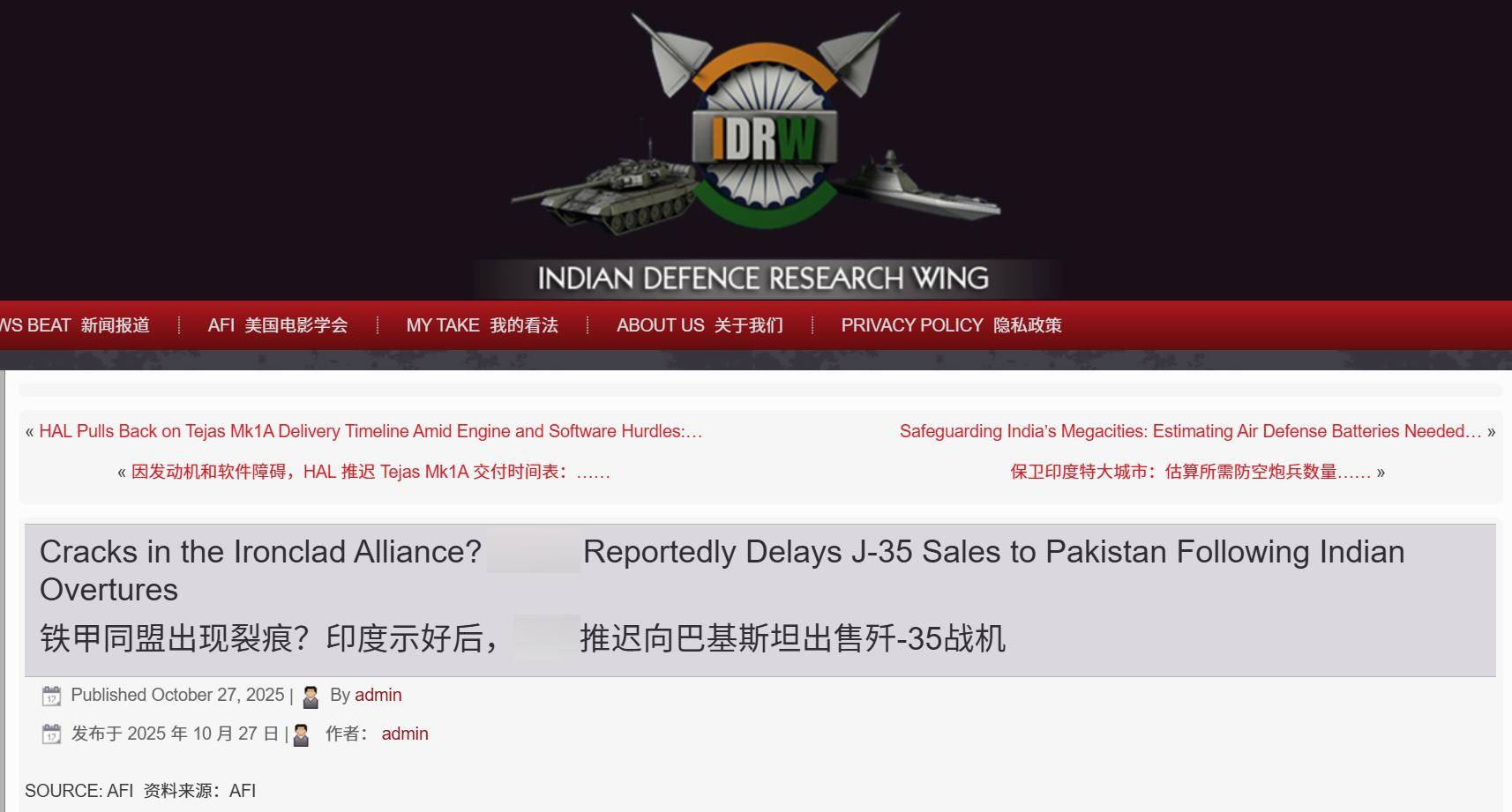 印度居然能搅黄歼-35出口订单?(印度媒体《印度国防研究》报道截图)