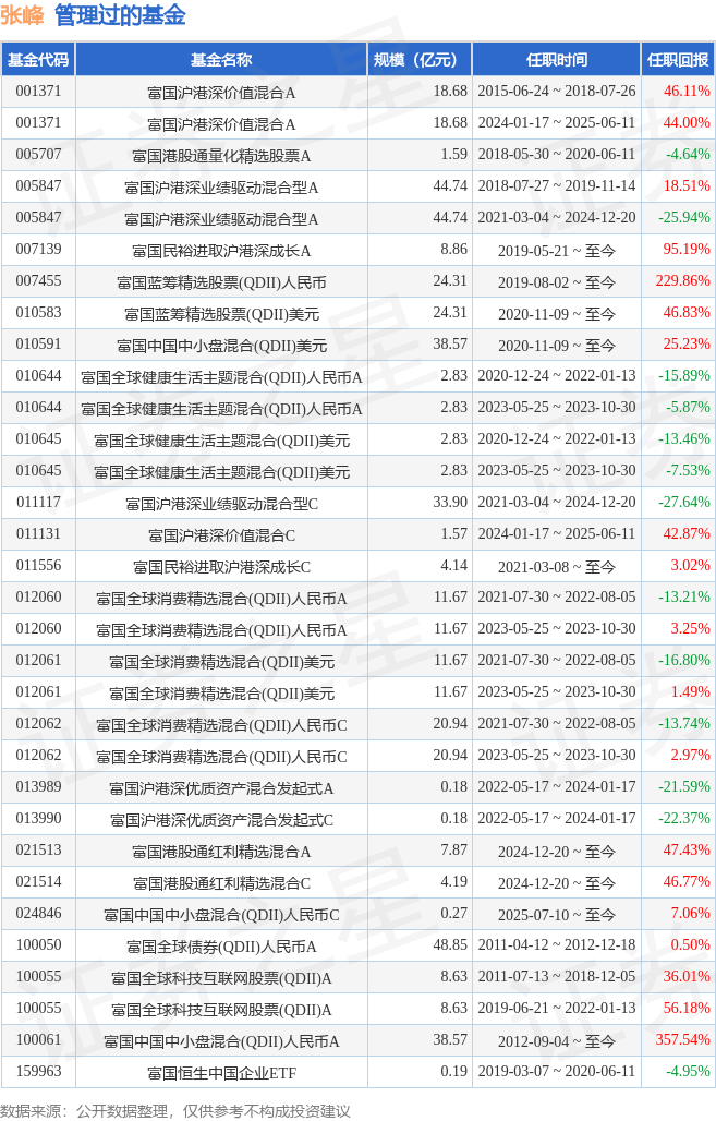 张峰先生:中国国籍,硕士,曾任摩根士丹利股票研究助理,里昂证券分析员,摩根大通执行董事,美林证券执行董事;自2009年7月加入富国基金管理有限公司,历任周期行业负责人、QDII基金经理、量化与海外投资部海外投资副总监、量化与海外投资部海外投资总监;现任富国基金总经理助理,兼任富国基金海外权益投资部总经理、资深QDII基金经理。2011年4月至2012年12月任富国全球债券证券投资基金基金经理,自2011年7月至2018年12月任富国全球科技互联网股票型证券投资基金(QDII)(原富国全球顶级消费品股票型证券投资基金,于2015年8月4日更名为富国全球顶级消费品混合型证券投资基金;最终于2018年6月19日更名为富国全球科技互联网股票型证券投资基金(QDII))基金经理,自2012年9月起任富国中国中小盘(香港上市)混合型证券投资基金(原富国中国中小盘(香港上市)股票型证券投资基金,于2015年8月4日更名)基金经理,自2015年6月至2018年7月任富国沪港深价值精选灵活配置混合型证券投资基金基金经理,自2018年5月至2020年6月任富国港股通量化精选股票型证券投资基金基金经理,2019年3月至2020年6月任富国恒生中国企业交易型开放式指数证券投资基金基金经理,2019年5月起任富国民裕进取沪港深成长精选混合型证券投资基金基金经理,2019年6月起任富国全球科技互联网股票型证券投资基金(QDII)(原富国全球顶级消费品股票型证券投资基金,于2015年8月4日更名为富国全球顶级消费品混合型证券投资基金;最终于2018年6月19日更名为富国全球科技互联网股票型证券投资基金(QDII))基金经理,2019年8月起任富国蓝筹精选股票型证券投资基金(QDII)基金经理,2020年12月起任富国全球健康生活主题混合型证券投资基金(QDII)基金经理,2021年3月起任富国沪港深业绩驱动混合型证券投资基金基金经理,2021年7月30日至2022年8月5日任富国全球消费精选混合型证券投资基金(QDII)基金经理。2024年1月17日至2025年06月11日担任富国沪港深价值精选灵活配置混合型证券投资基金的基金经理。2022年5月17日至2024年1月17日担任富国沪港深优质资产混合型发起式证券投资基金的基金经理。曾任富国沪港深业绩驱动混合型证券投资基金基金经理。2024年12月20日担任富国港股通红利精选混合型证券投资基金基金经理。具有基金从业资格。