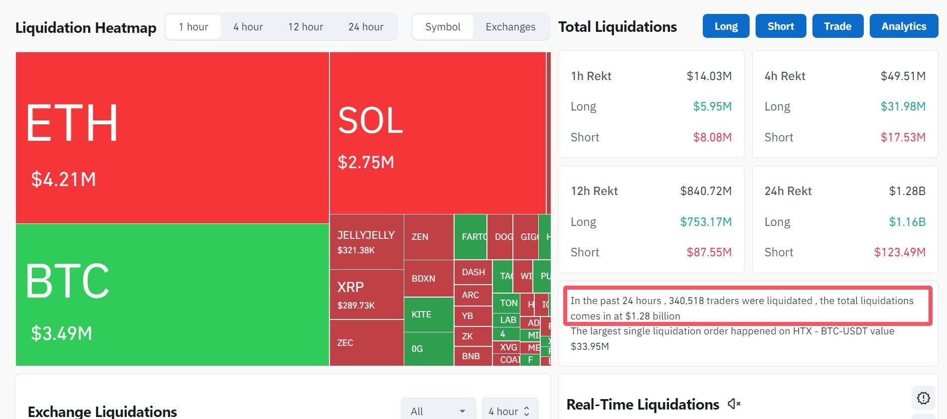 截至北京时间11月4日8时许,加密货币全市场超34万人被爆仓。