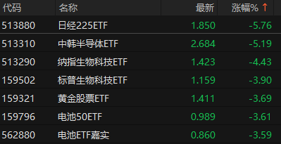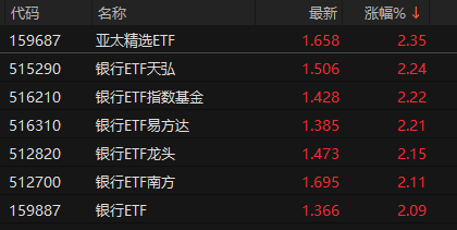 11月4日,ETF收盘涨跌不一,亚太精选ETF(159687)领涨2.35%,银行ETF天弘(515290)涨2.24%,银行ETF指数基金(516210)涨2.22%。下跌方面,日经225ETF(513880)跌5.76%,中韩半导体ETF(513310)跌5.19%,纳指生物科技ETF(513290)跌4.43%。