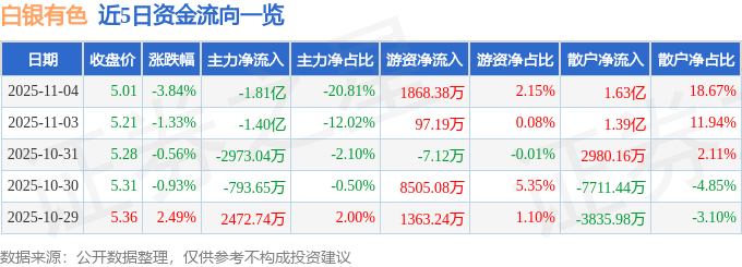 白银有色(601212)11月4日主力资金净卖出1.81亿元