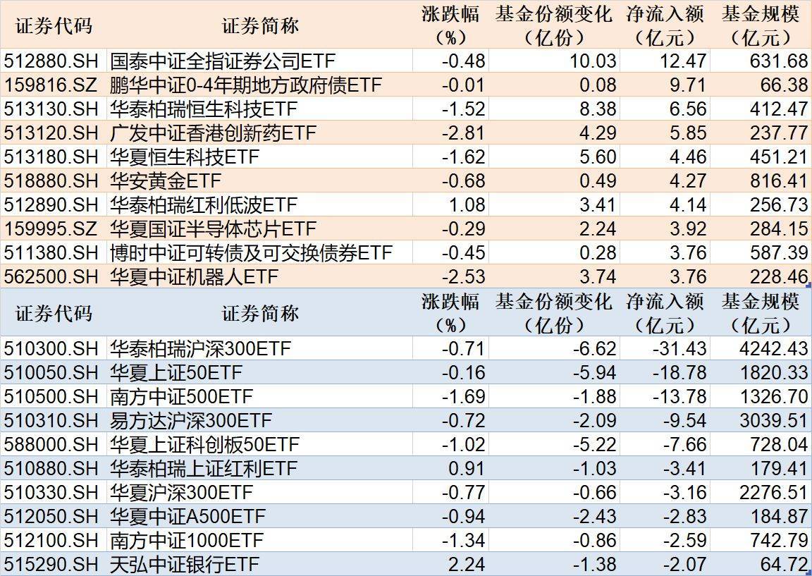 与此同时,华泰柏瑞沪深300ETF基金份额减少6.62亿份,净流出额为31.43亿元;华夏上证50ETF基金份额减少5.94亿份,净流出额为18.78亿元;南方中证500ETF基金份额减少1.88亿份,净流出额为13.78亿元。