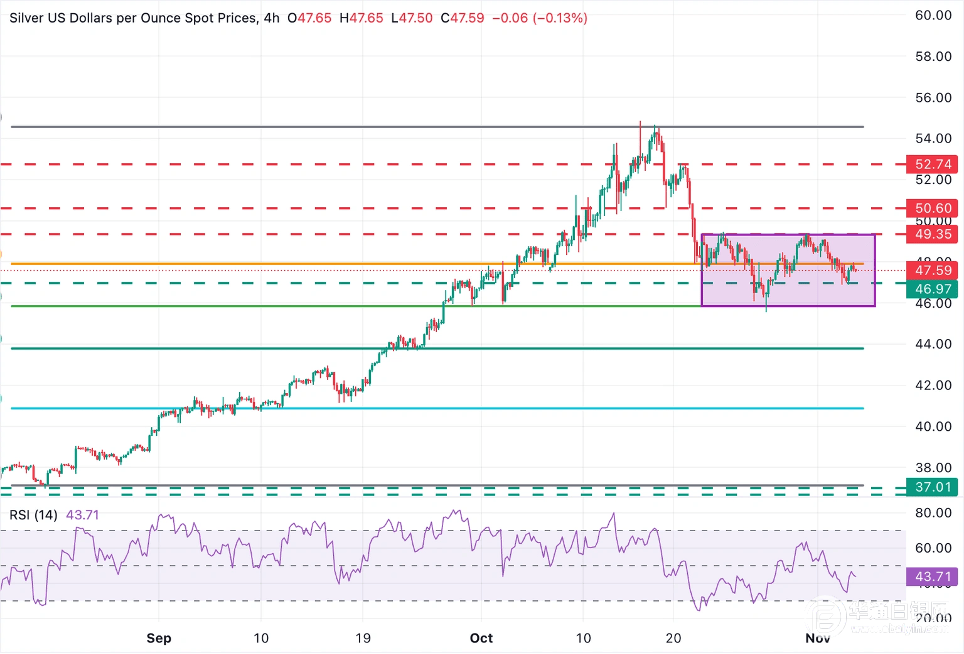 从技术角度看,由于白银从54.86美元的长期高点进行修正逆转,在8-10月反弹的50%斐波那契回撤位45.85美元附近找到了支撑,因此白银在过去两周区间的中间进行交易。此后,白银一直在该水平和49.35美元之间反弹。