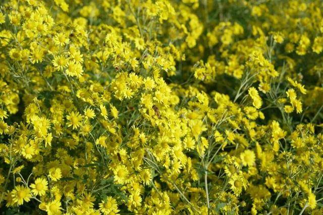 连片的野菊花竞相绽放,金黄花瓣随风翻滚成金色浪涛,清冽菊香弥漫山野。村民们穿梭花丛间,指尖轻捻、俯身采收,采收现场的花朵分离机械设备轰鸣作响,与欢声笑语交织成丰收的乐章。