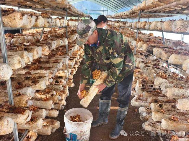 清晨的薄雾还未散尽,徽县榆树乡辛亮菌业食用菌种植基地里,工人们早已穿梭在菌架间,娴熟地采摘、分拣、装筐,确保滑子菇抢“鲜”上市。