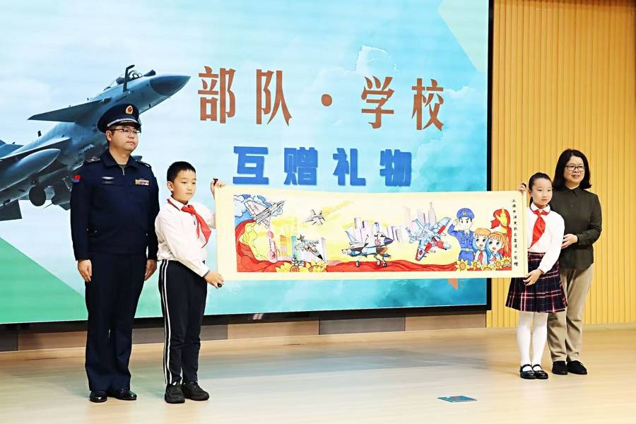 军民鱼水情深,互动暖意融融。驻沪空军部队与莲溪小学互赠空军节礼物:学校“小画家”们创作的《我心中的战鹰》长卷,绘满孩子们对蓝天的向往与对空军的崇敬;部队回赠的新一代歼-35A模型,让少年儿童直观感受中国空军硬核实力。
