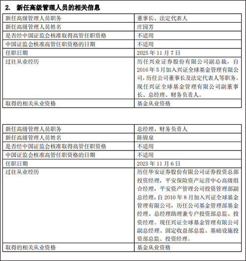 庄园芳升任公司董事长后,兴证全球基金总经理则由原副总经理陈锦泉接任。