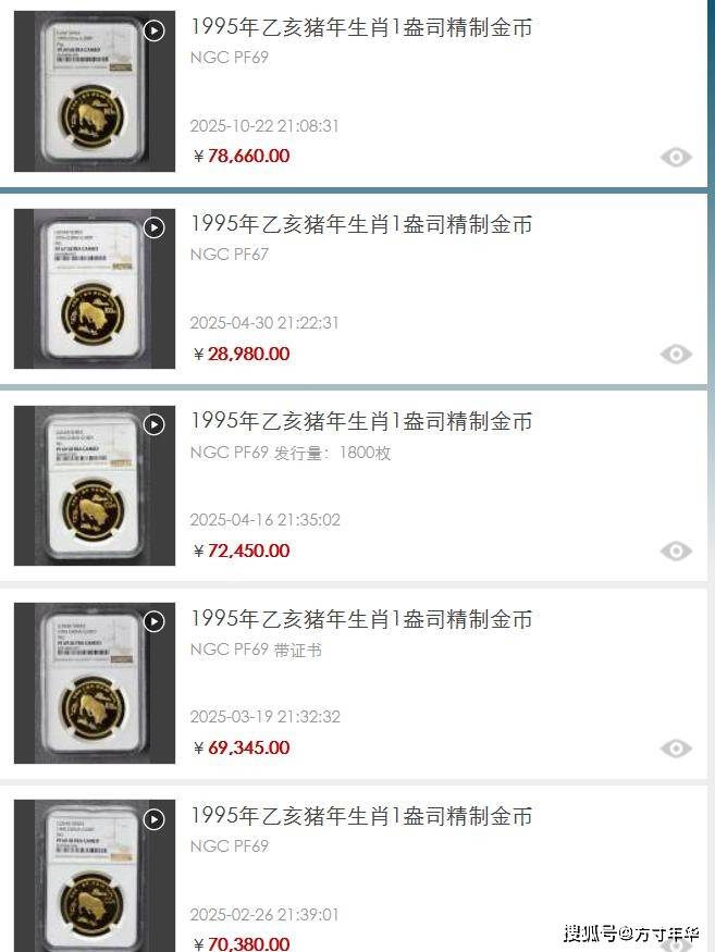 枚猪年金币的成交轨迹:PF69高分品相,2024年下半年卖到89,010元、90,045元,2025年仍保持70,380元-78,660元的价位;PF67品相的,从21,73元涨到28,980元。这说明品相越好、存世越稀,价格天花板越高,抗跌性也越强