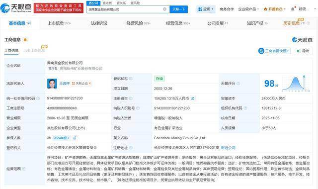 湖南黄金股份有限公司成立于2000年12月,法定代表人为王选祥,经营范围包括矿产资源勘查、金属与非金属矿产资源地质勘探、非煤矿山矿产资源开采、测绘服务等。股东信息显示,该公司由湖南黄金集团有限责任公司、香港中央结算有限公司等共同持股。