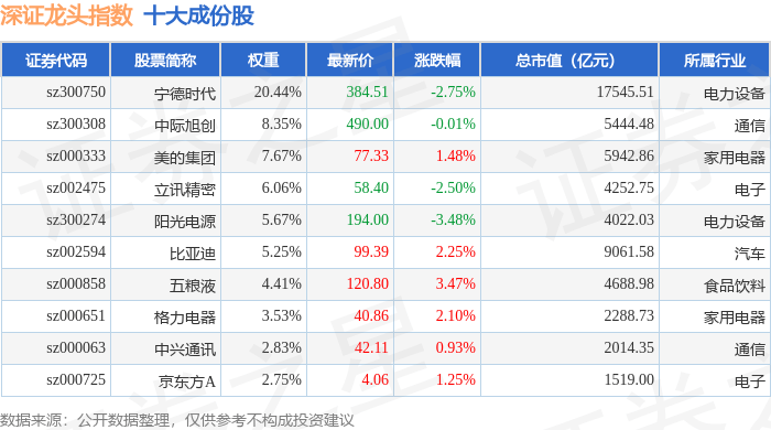 证券之星消息,11月10日,深证龙头(399653)指数报收于3070.65点,涨0.2%,成交1185.22亿元,换手率1.28%。当日该指数成份股中,上涨的有41家,瑞达期货以9.99%的涨幅领涨,下跌的有8家,三花智控以6.01%的跌幅领跌。