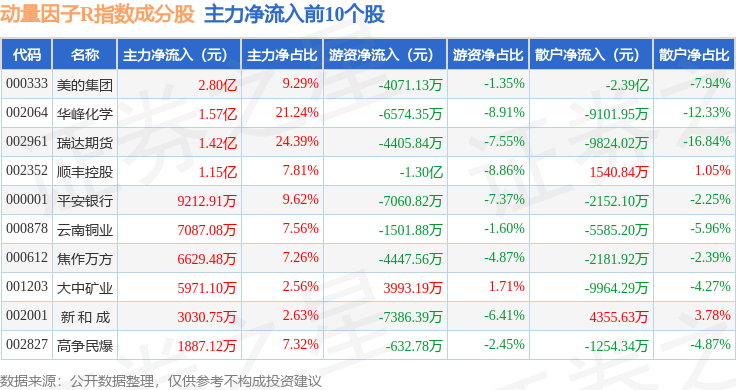 资金流向方面,动量因子R(480057)指数成份股当日主力资金净流出合计6.97亿元,游资资金净流出合计1.54亿元,散户资金净流入合计8.51亿元。成份股资金流向详情见下表: