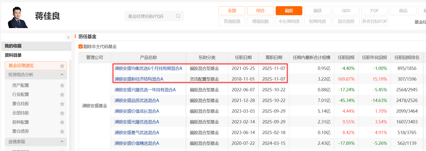 他的离任并非突发。9月29日,蒋佳良率先退出浦银安盛价值成长混合、光耀优选混合;10月22日,再卸任品质优选混合、兴耀优选一年持有;至11月7日,最后两只由其管理的浦银安盛新经济结构混合、均衡优选6个月持有完成变更。可以看出,公司早已安排好承接团队,调整具有明确的计划性。
