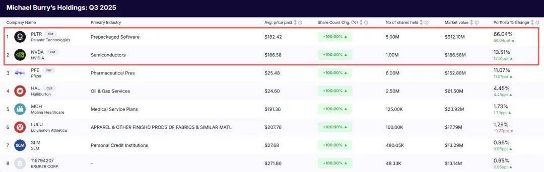 目前,Scion Asset Management的总持仓资金约为13.8亿美元,其中大部分资金都集中在英伟达和Palantir的看跌期权上。截至2025年第三季度末,该基金持有价值约9.12亿美元的500万股Palantir看跌期权和价值约1.87亿美元的100万股英伟达看跌期权。