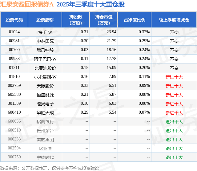 根据2025基金Q3季报公募基金重仓股数据,重仓该股的公募基金共1家,其中持有数量最多的公募基金为汇泉基金的汇泉安盈回报债券A。汇泉安盈回报债券A目前规模为0.63亿元,最新净值1.0638(11月11日),较上一交易日上涨0.05%,近一年上涨3.79%。该公募基金现任基金经理为杨宇 汪雨晨。杨宇在任的基金产品包括:汇泉匠心智选一年持有混合A,管理时间为2022年9月13日至今,期间收益率为16.47%;汇泉中证同业存单AAA指数7天持有,管理时间为2024年1月23日至今,期间收益率为1.86%;汇泉安阳纯债A,管理时间为2024年3月20日至今,期间收益率为39.42%。汪雨晨在任的基金产品包括:汇泉安阳纯债A,管理时间为2024年11月22日至今,期间收益率为1.18%;汇泉中证同业存单AAA指数7天持有,管理时间为2025年2月19日至今,期间收益率为1.1%;汇泉安瑞回报债券A,管理时间为2025年6月25日至今,期间收益率为1.3%;