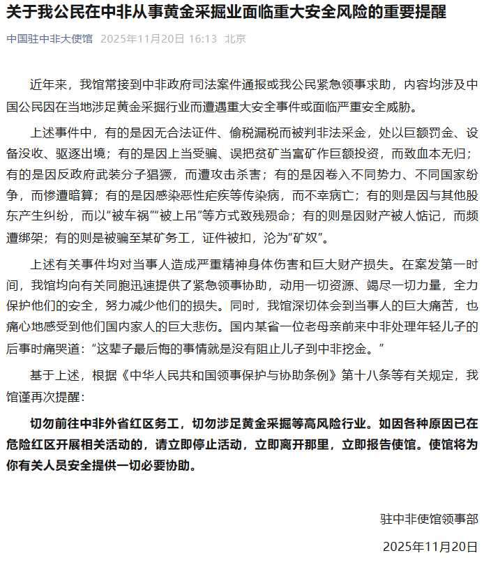 据中国驻中非大使馆微信公众消息,11月20日,中国驻中非使馆领事部发布关于我公民在中非从事黄金采掘业面临重大安全风险的重要提醒: