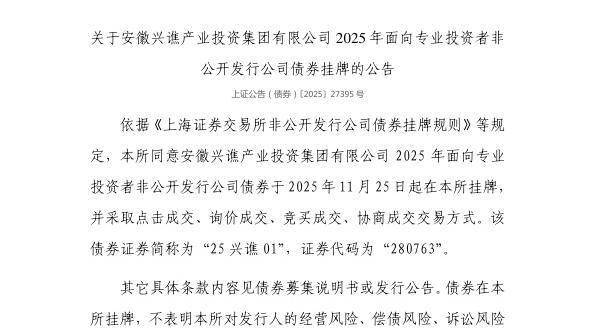 依据《上海证券交易所非公开发行公司债券挂牌规则》等规定,上交所同意安徽兴谯产业投资集团有限公司2025年面向专业投资者非公开发行公司债券于2025年11月25日起在上交所挂牌,并采取点击成交、询价成交、竞买成交、协商成交交易方式。该债券证券简称为“25兴谯01”,证券代码为“280763”。