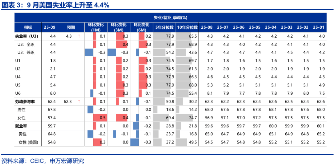 非农数据质量、劳动力供给改善对“非农强劲、失业恶化”的解释力不强。1)9月机构调查的首次回复率高达80.2%,显著高于历史均值,数据可信度较高;2)9月失业率上升0.12个百分点,主要推动力来自于“失业或离职”人群,而“新进入劳动力市场”群体贡献基本不变。